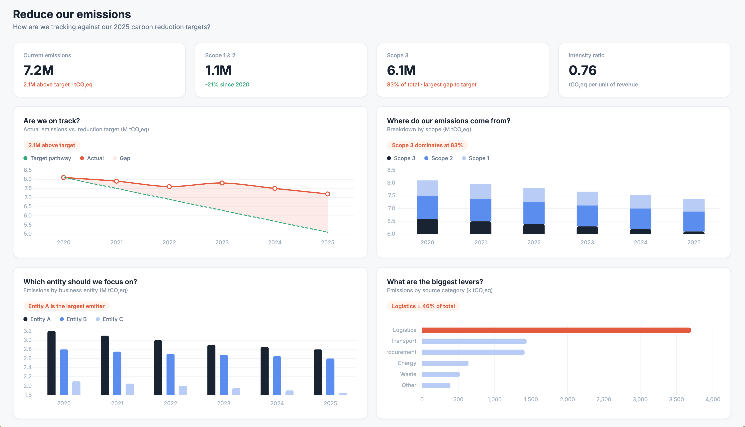 What changed? The titles now ask questions: “Are we on track?”, “Which entity should we focus on?” Colour is used with meaning, like red flags where targets are missed. And each chart carries a short annotation underneath the headline.