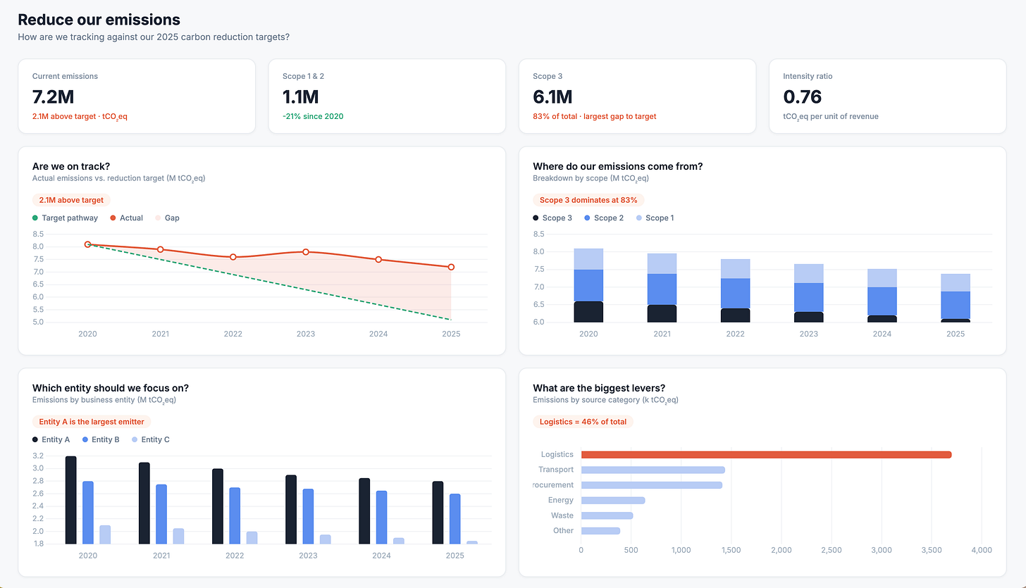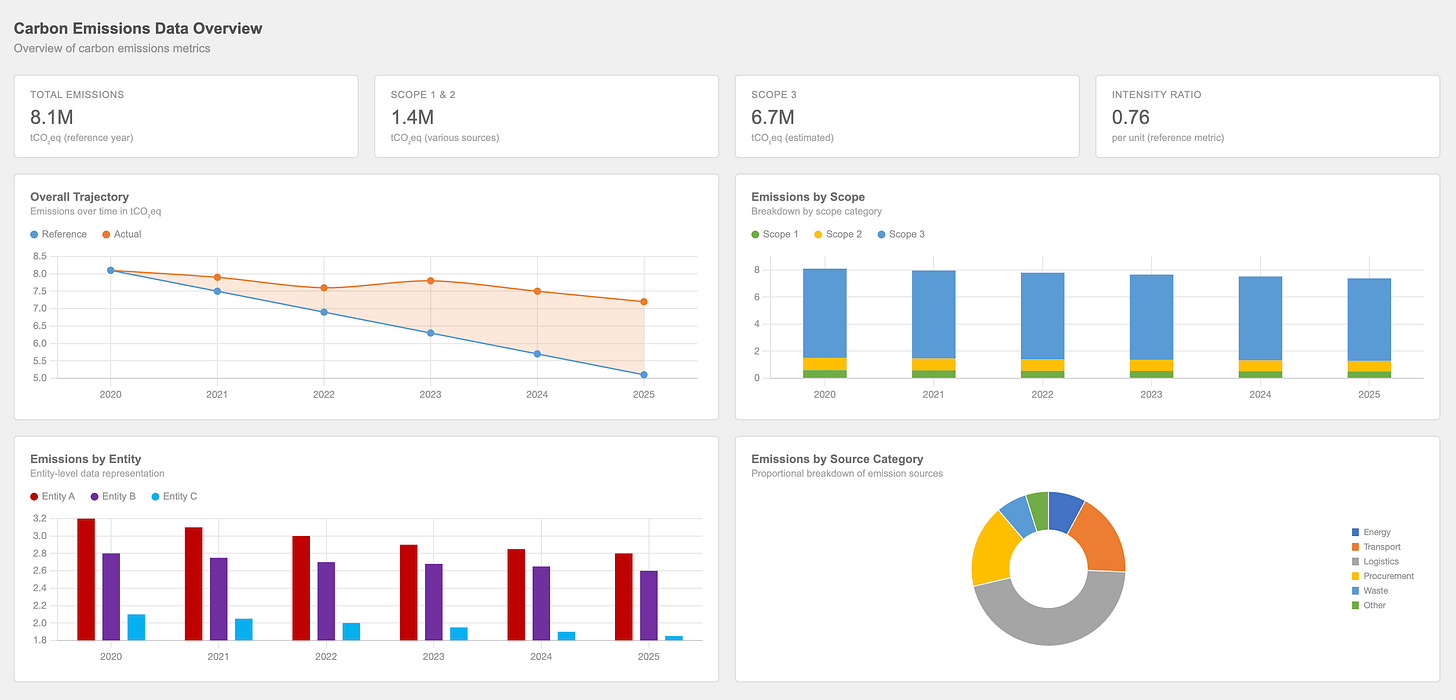 Take this generic carbon emissions dashboard. What do you feel looking at it? Probably nothing. It’s accurate, sure, but it doesn’t make you feel anything.