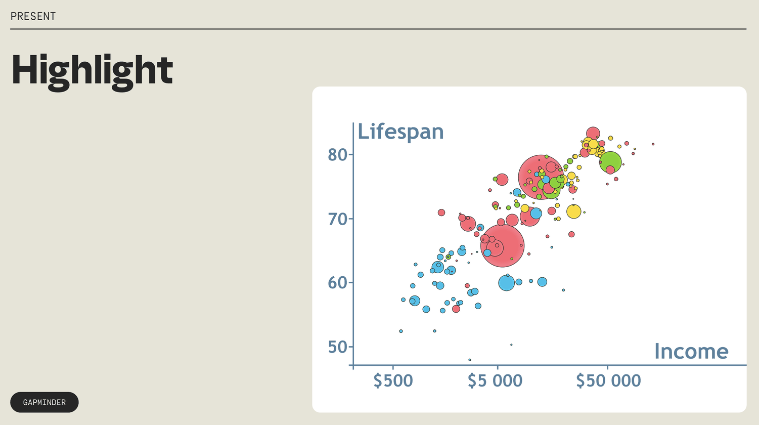 You can add surprise to your presentations in a couple of ways. Highlight elements one by one, like in this Gapminder example.