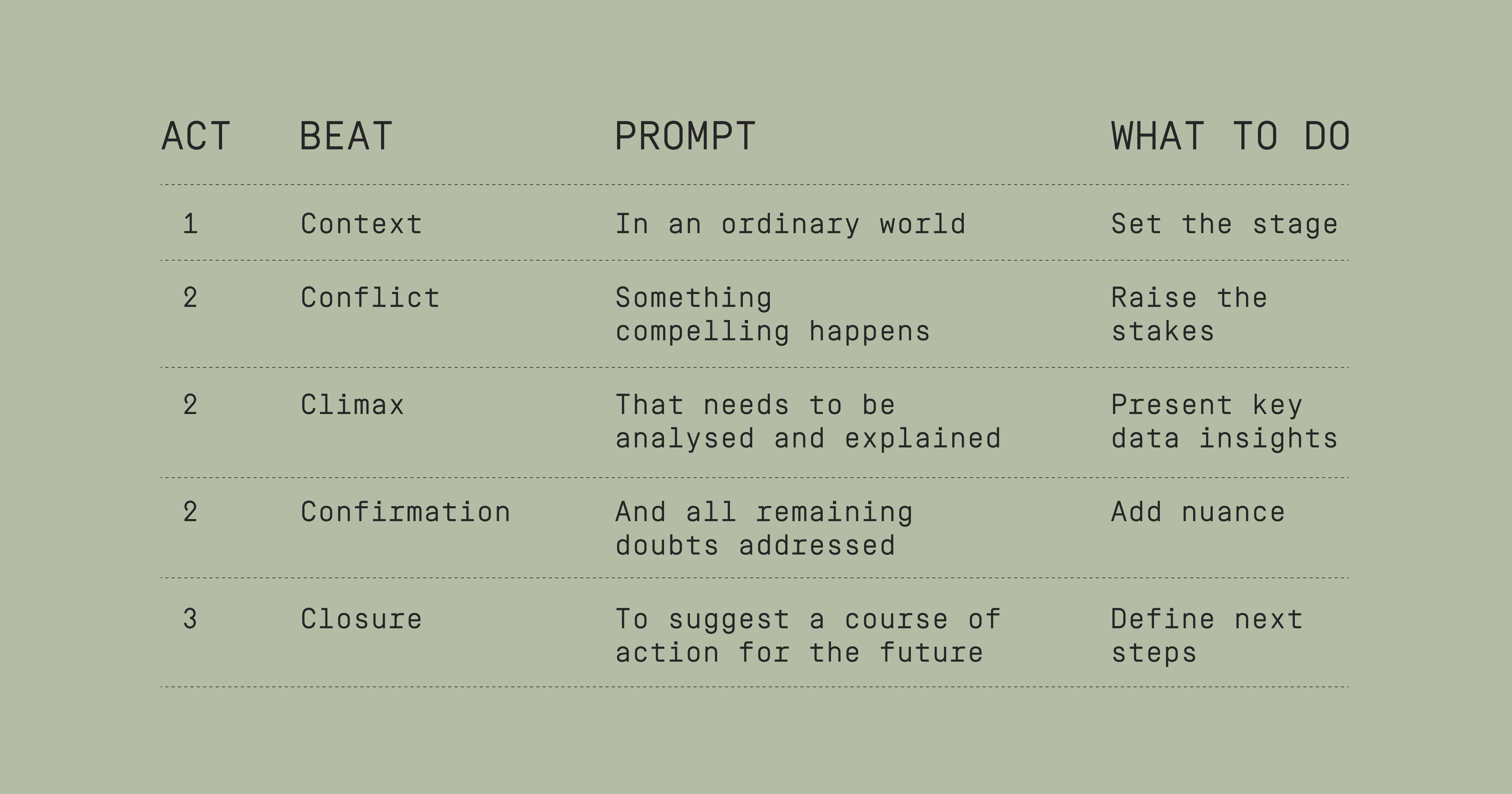 Here’s a sneak peek into the five-point narrative structure I teach in my workshops. We borrow just enough storyline elements from screenwriting and apply them to data communication.