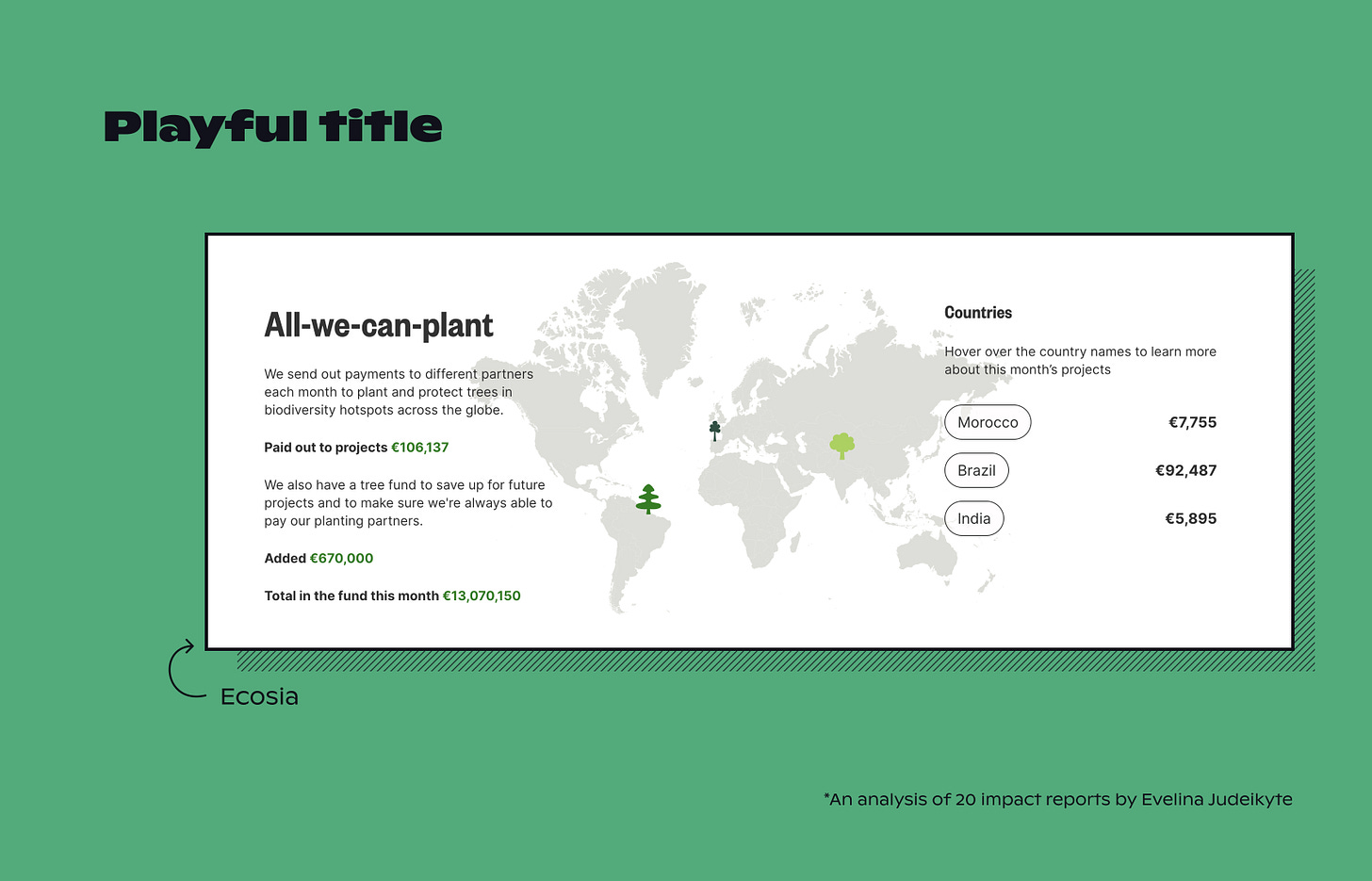 You can also get a little more creative. A catchy title grabs the audience’s attention without telling them what the message is just yet. In this scenario, you can repurpose familiar concepts—often from unrelated spheres of life—in a playful way. For instance, in this map by Ecosia, the designers used the all-you-can-eat descriptor for tree planting.