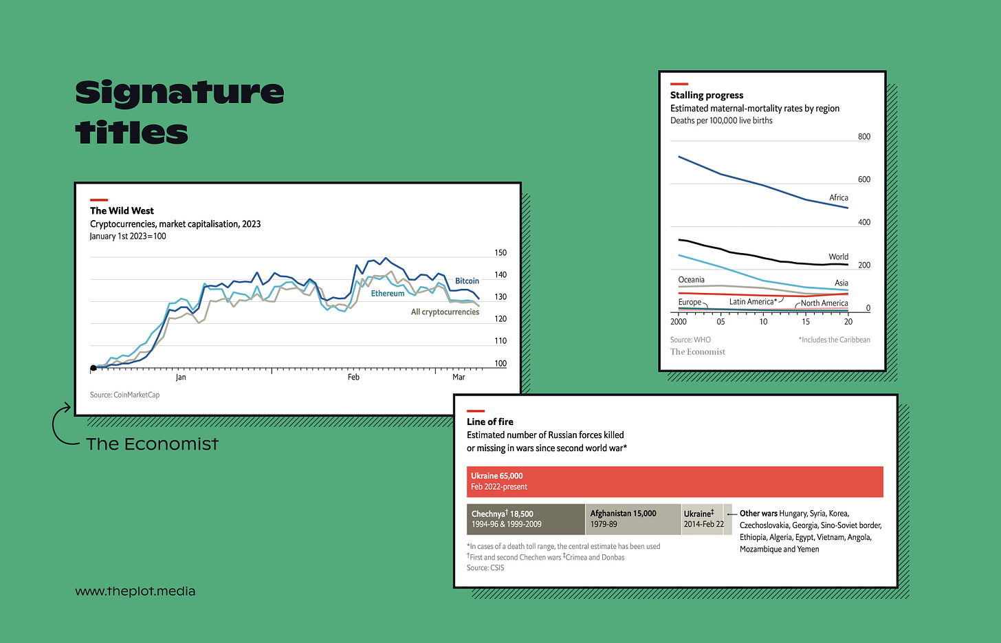 A defined framework for chart titles can also become a recognisable element of your design system. The team at The Economist is known for writing short and sharp titles for their graphics, such as the ones below. That, combined with a consistent design style, gives their work a professional look—more on that in the next newsletter! Notice also how the descriptive version of the title isn’t dropped; it merely becomes a subtitle. You still need to explain what the data metrics are, it just shouldn’t be your hook.