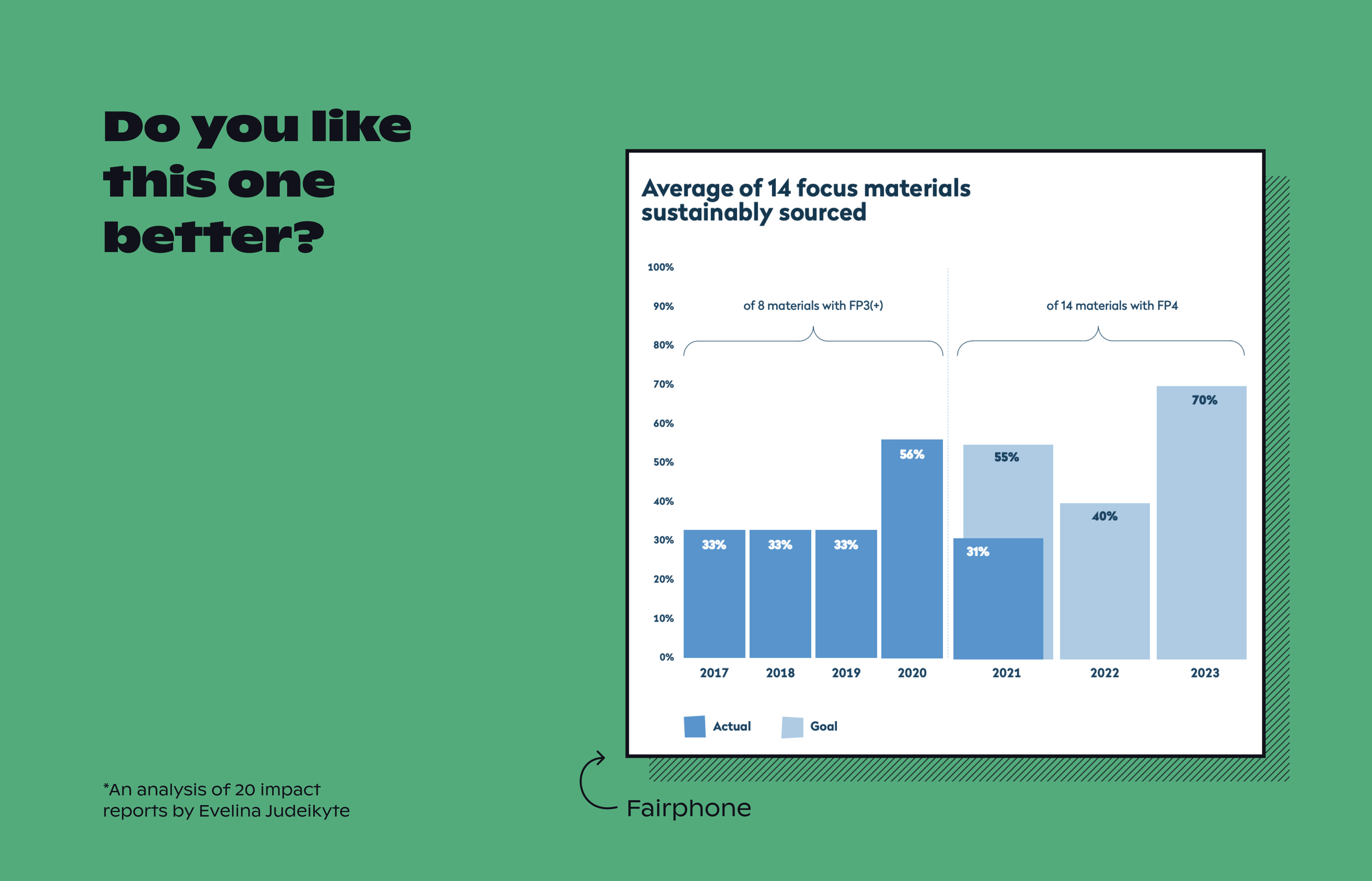 You can go about it in at least two different ways. The first is essentially a statement of the key takeaway. In this scenario, you spell out the message from the data in the title, rather than leaving the audience to figure it out for themselves. So instead of saying “portion of materials sourced sustainably”, you specify that “14 of all materials were sustainably sourced last year”. This creates message redundancy—the main insight is repeated multiple times, which increases the chances of memorability.