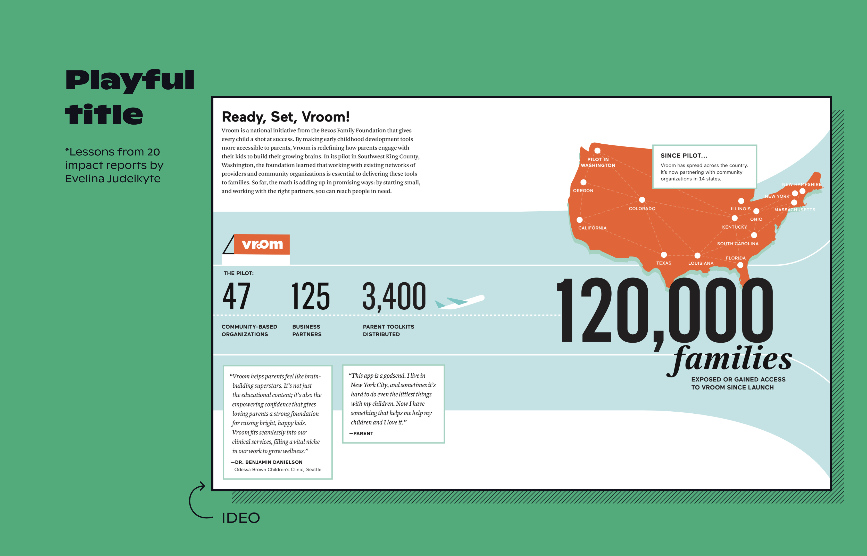 And in this infographic by IDEO, a figure of speech is used: tricolon. A tricolon is a rhetorical device involving three words or groups of words with the same grammatical structure. It’s considered to be one of the most powerful rhetorical figures: apparently, our brain absorbs information more efficiently when it’s packaged in threes. So when you read “Ready, Set, Vroom”, you’re probably much more likely to engage with the infographic than if it were called “The reach of the Vroom foundation”.