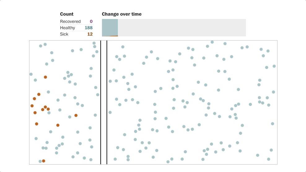 A brilliant illustration of this is the article called Why outbreaks like coronavirus spread exponentially by Harry Stevens (remember the Covid lockdowns?). It illustrates how the virus travels between us and what social distancing can do.