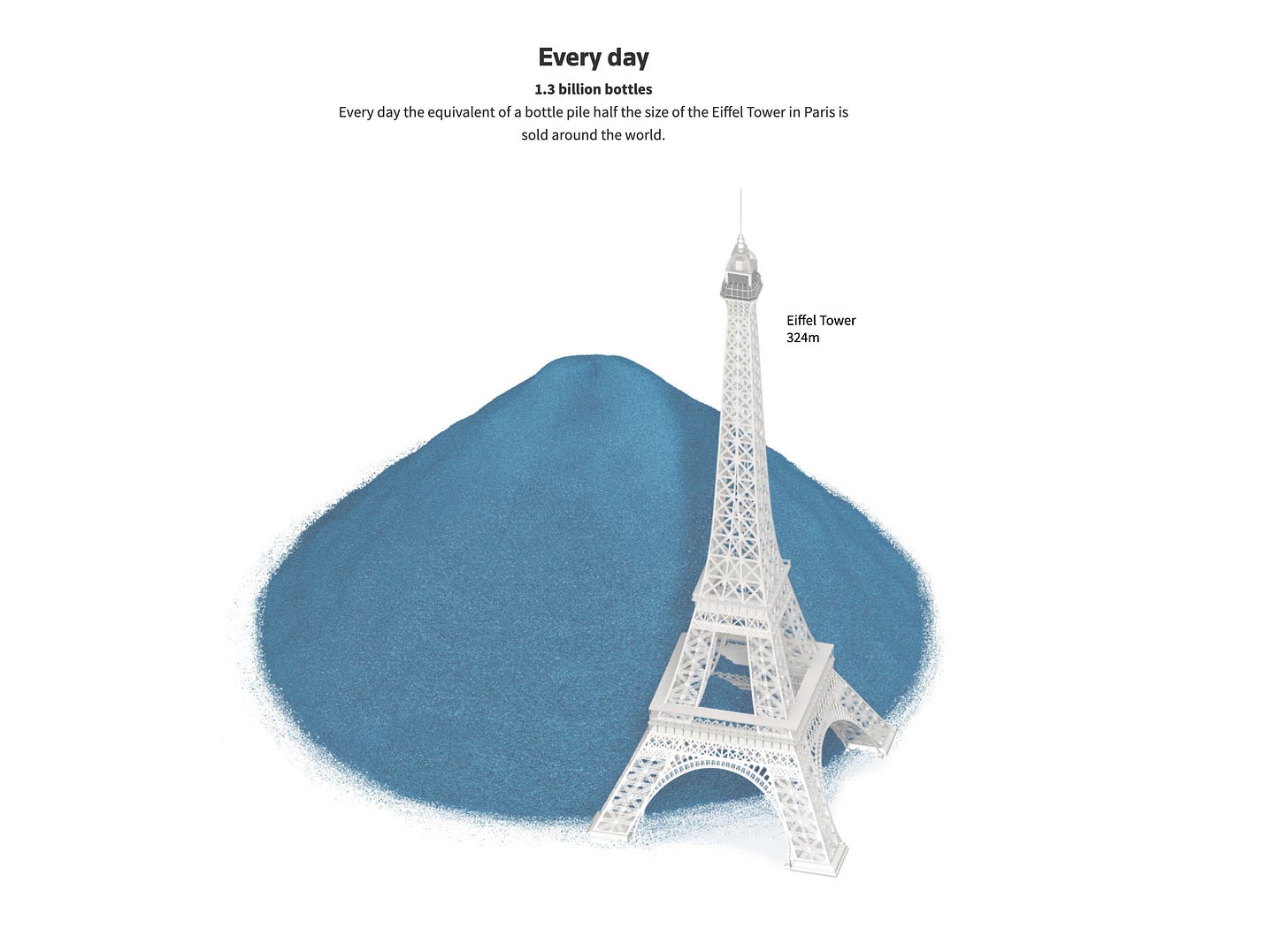 This works because it solves the problem of abstraction. We cannot visualise "billions of bottles," but we can visualise the Eiffel Tower. By literally "drowning" a city in data points, the graphic triggers a feeling of suffocation and scale that a spreadsheet never could.